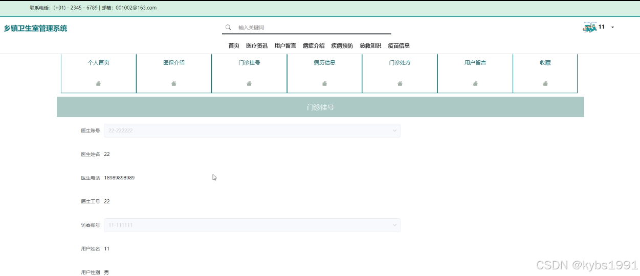 (9)门诊挂号:当用户点击右上角“用户”按钮下面的“个人中心”,会进入到门诊挂号页面,点击“门诊挂号”可以查看自己提交的挂号信息;