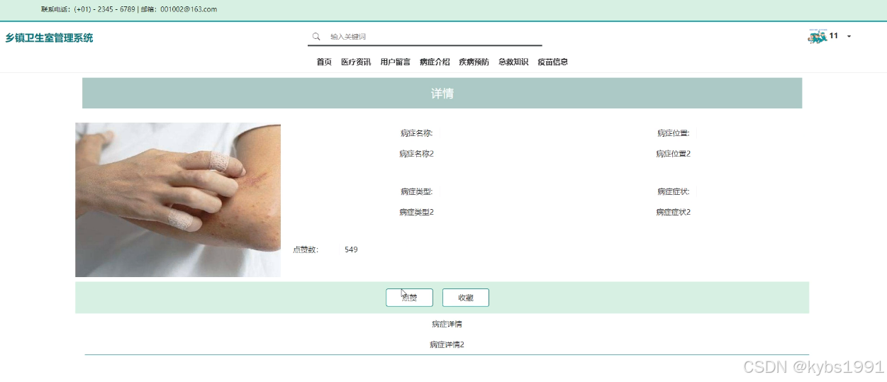 (4)病症介绍:当用户点击“病症介绍”这一菜单按钮,会显示管理员在后台发布的所有的病症介绍,可以查看详情,进行收藏、点赞、评论等;
