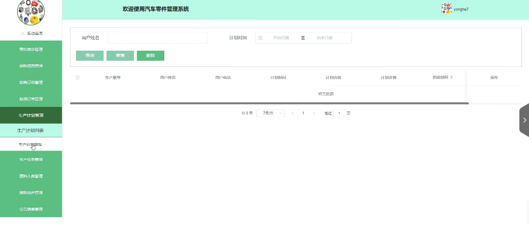 生产计划管理:生产用户拥有查看、删除生产计划列表的权限,也可以添加新的生产计划.