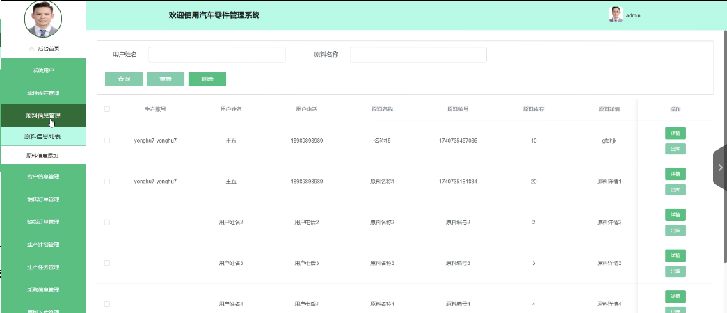 - 原料信息管理:管理员拥有查看、删除原料信息列表的权限,也可以添加新的原料信息。