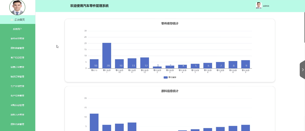 - 后台首页:管理员具备管理个人信息的权限,涵盖编辑个人资料、更换个人头像以及修改账户密码等多项操作,查看零件库存统计、原料信息统计图。