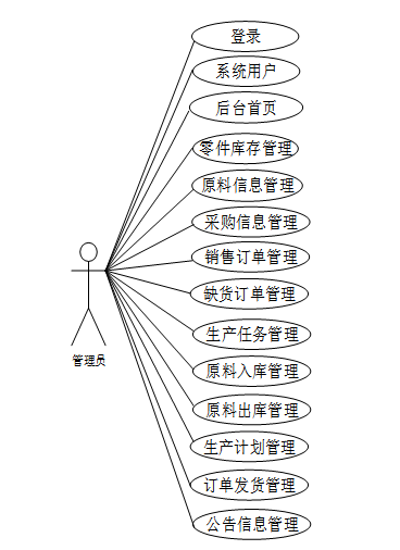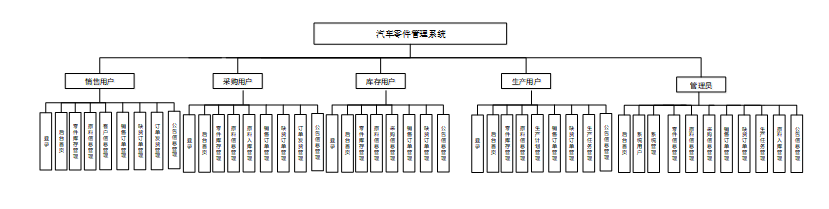 汽车零件管理系统功能方面,销售用户模块功能包括登录、首页、零件库存管理、原料信息管理、客户信息管理、销售订单管理、缺货订单管理、订单发货管理、公告信息管理;采购用户模块功能包括登录、首页、零件库存管理、原料信息管理、销售订单管理、缺货订单管理、采购信息管理、公告信息管理;生产用户模块功能包括登录、首页、原料信息管理、销售订单管理、缺货订单管理、生产计划管理、生产任务管理、零件入库管理、零件出库管理、公告信息管理;库存用户模块功能包括登录、首页、原料信息管理、销售订单管理、缺货订单管理、零件入库管理、零件出库管理、订单发货管理、公告信息管理;管理员模块功能包括后台首页、系统用户、原料信息管理、客户信息管理、销售订单管理、缺货订单管理、生产计划管理、生产任务管理、采购信息管理、零件入库管理、零件出库管理、零件入库管理、零件出库管理、订单发货管理、供应商家管理、公告信息管理。具体的功能模块图如图3-2所示。