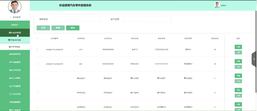 - 零件库存管理:管理员拥有查看、删除零件库存列表的权限,也可以添加新的零件库存。