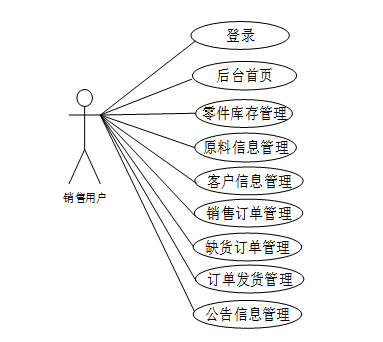系统用例分析的核心价值在于深度解构系统业务单元间的交互诉求与行为路径,通过精准捕获和结构化映射多维度用户情境,构建用户全生命周期操作模型。该方法体系有效构建用户操作链路与交互触点的认知框架,为技术实现提供行为驱动的设计依据,最终实现服务体验的精准提升。销售用户角色用例如图2-4。