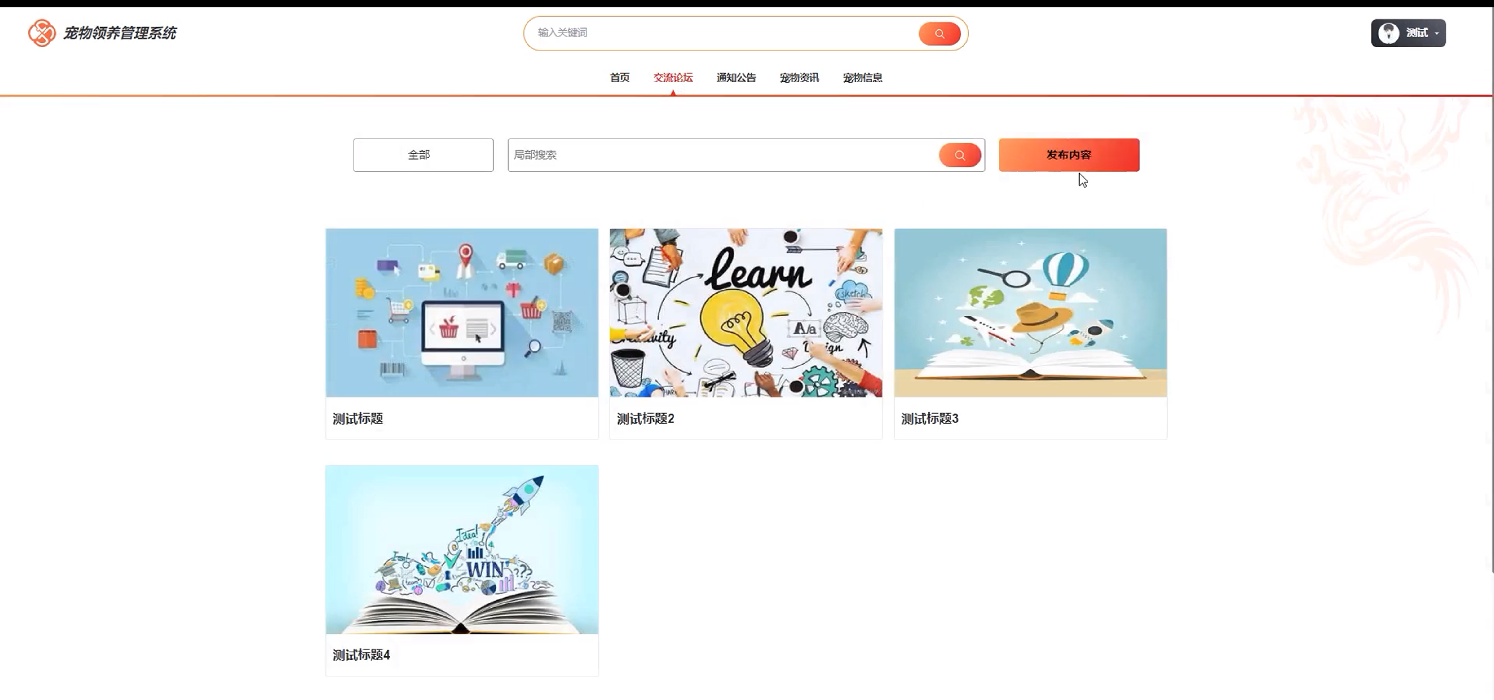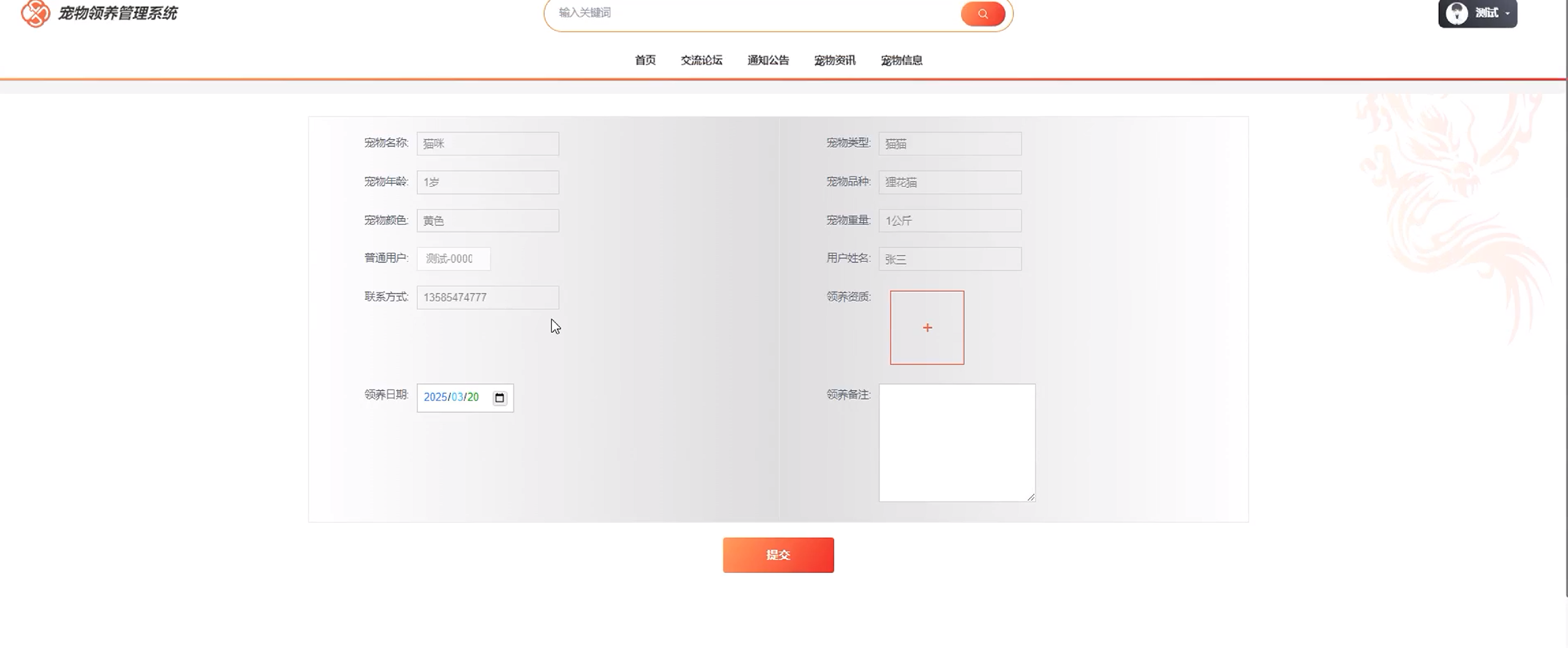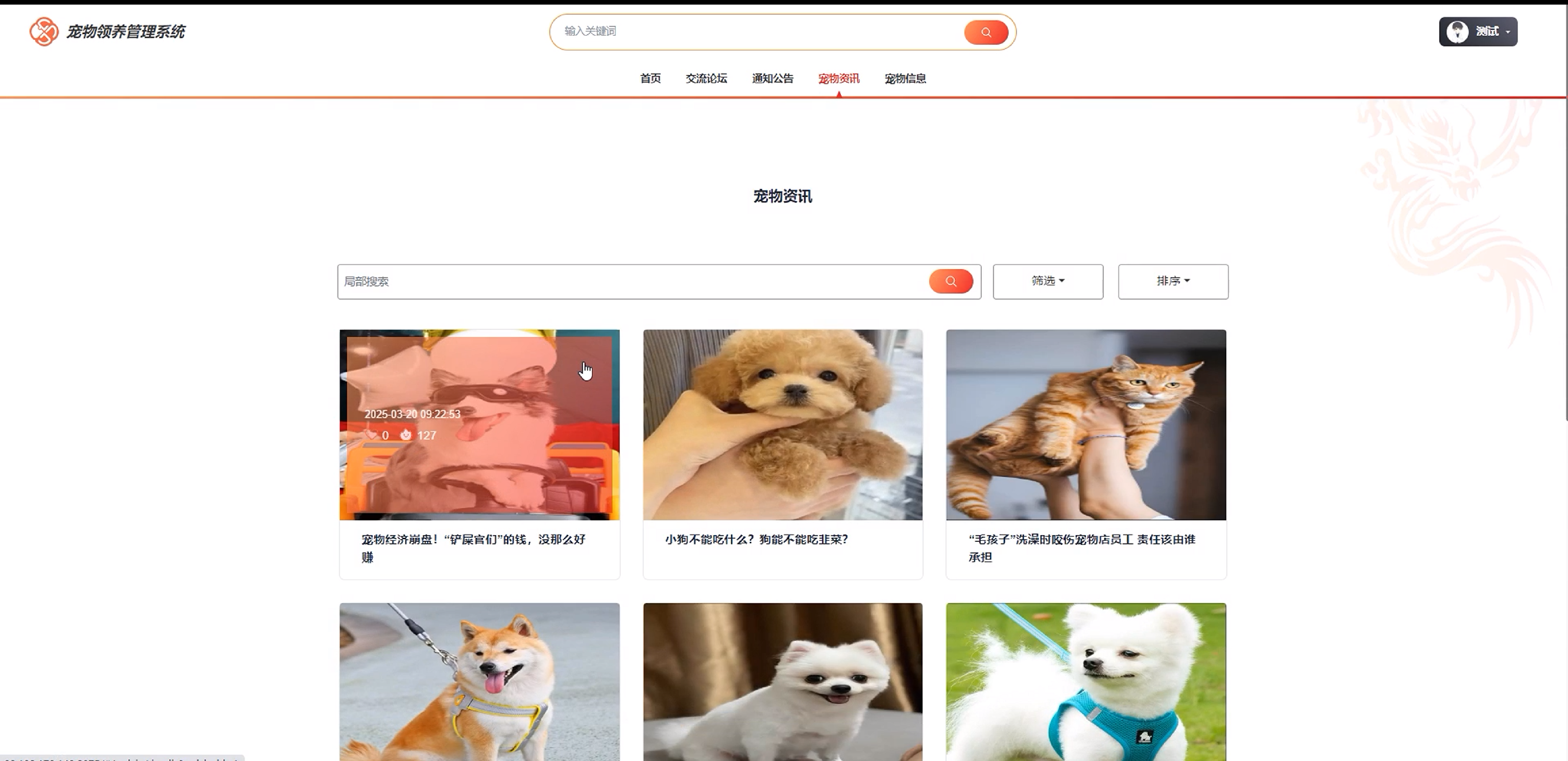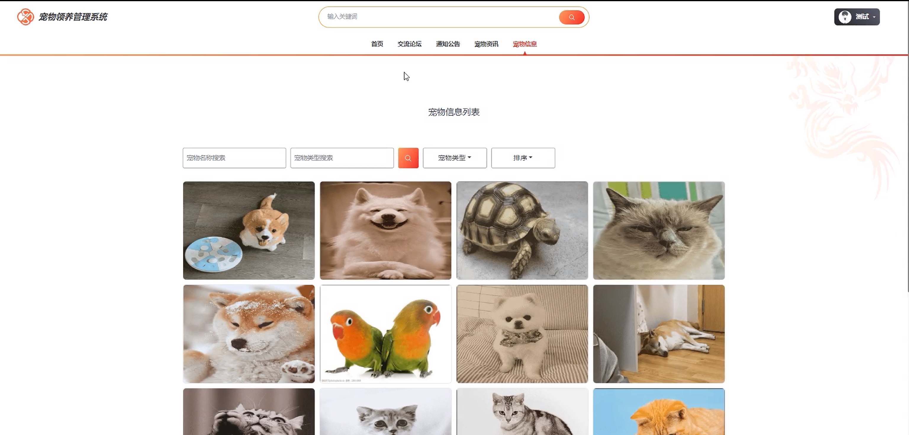 | 查看宠物信息测试 | 登录系统 进入宠物信息页面 使用搜索栏输入关键词搜索宠物信息 | 无 | 符合预期 |