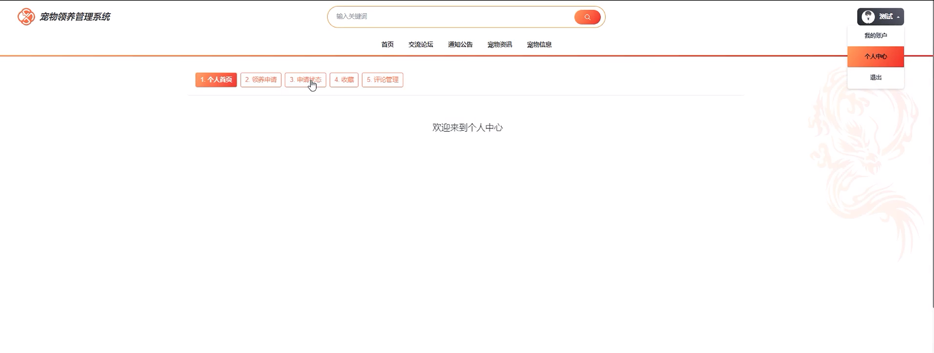 个人中心:个人中心包含多个功能模块,如个人首页、领养申请、申请状态、收藏和评论管理。用户点击可查看领养申请审核状态和申请状态。同时可对历史收藏信息和评论进行查看或删除。界面如图5-5所示。