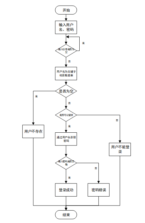 用户输入用户名和密码后,系统先检查输入是否为空,再验证用户名是否存在,若存在则通过用户名获取密码并校验。若密码正确则登录成功,否则提示密码错误。若用户名不存在或无法登录,提示用户操作无效。如图3-4所示。