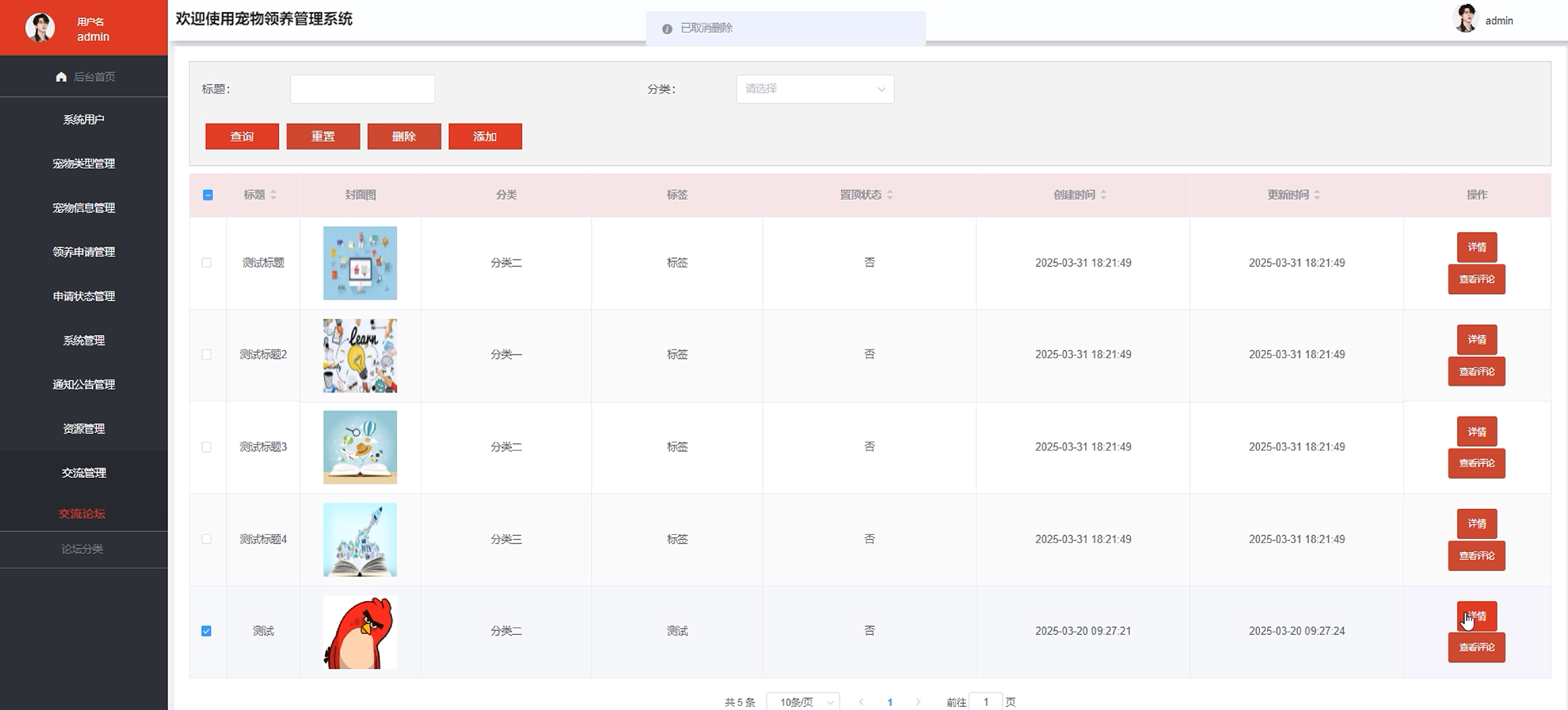 The pet adoption management system based on Spring Boot optimizes the pet adoption process by means of information, and improves the user experience and management efficiency. Ordinary users can register and log in through the system, browse the home page, participate in exchange forums, view notices and pet information, and inquire pet information. Users can not only search and view details, but also submit adoption applications, track application status and manage favorites and comments in the Personal Center. The specially designed communication forum module of the system promotes experience sharing and exchange among users, and enhances community interaction and user stickiness.