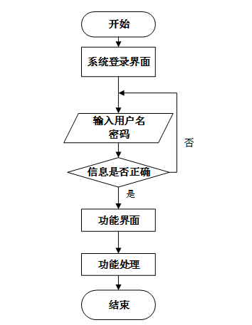 用户首先进入系统登录界面,输入用户名和密码后,系统验证信息是否正确。若验证失败,返回登录界面重新输入;若验证成功,则进入功能界面,执行相应功能处理后结束操作流程。操作流程如图3-5所示。