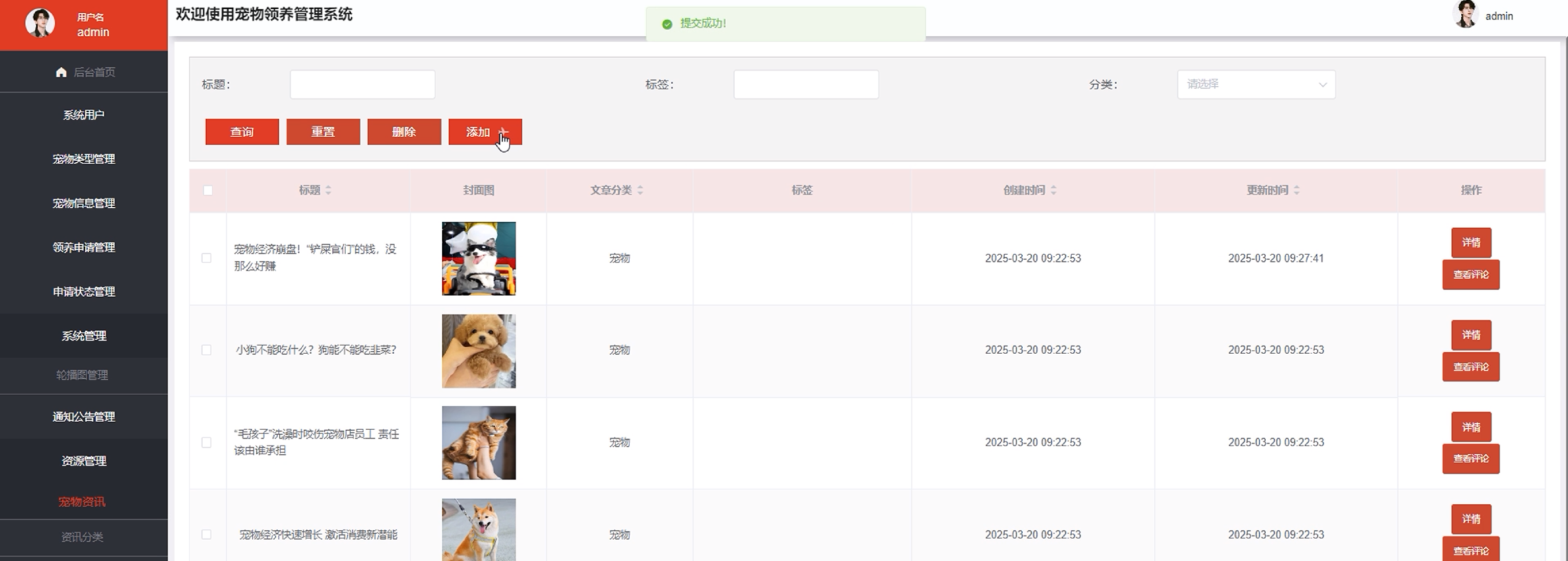 资源管理:管理员点击可查宠物资讯和资讯分类;如需添加新的资讯,点击“添加”按钮,上传封面图,输入标题,选择分类,输入标签、描述和正文,点击“确认”按钮进行添加。同时可对资讯和分类进行增删改查。界面如图5-9所示。