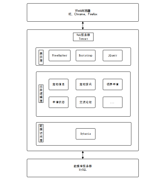 系统由表现层、业务逻辑层、数据访问层和数据库服务器组成。表现层通过浏览器(如IE、Chrome、Firefox)与用户交互,采用FreeMarker、Bootstrap、jQuery等技术实现界面呈现。业务逻辑层负责处理系统的核心业务逻辑,通过分模块设计实现功能分离。数据访问层使用MyBatis框架连接数据库,执行数据的增删改查操作。数据库服务器采用MySQL进行数据存储和管理,为系统提供稳定的数据库支持。整个架构通过Tomcat服务器完成用户请求的接收和处理,确保系统的高效运行[8]。整个系统架构如图4-1所示。