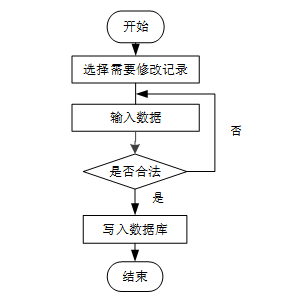 用户首先选择需要修改的记录,输入修改后的数据,系统判断输入数据是否合法。若数据不合法,提示重新输入;若数据合法,则将修改后的数据写入数据库,完成操作后流程结束。修改信息流程图如图3-7所示。