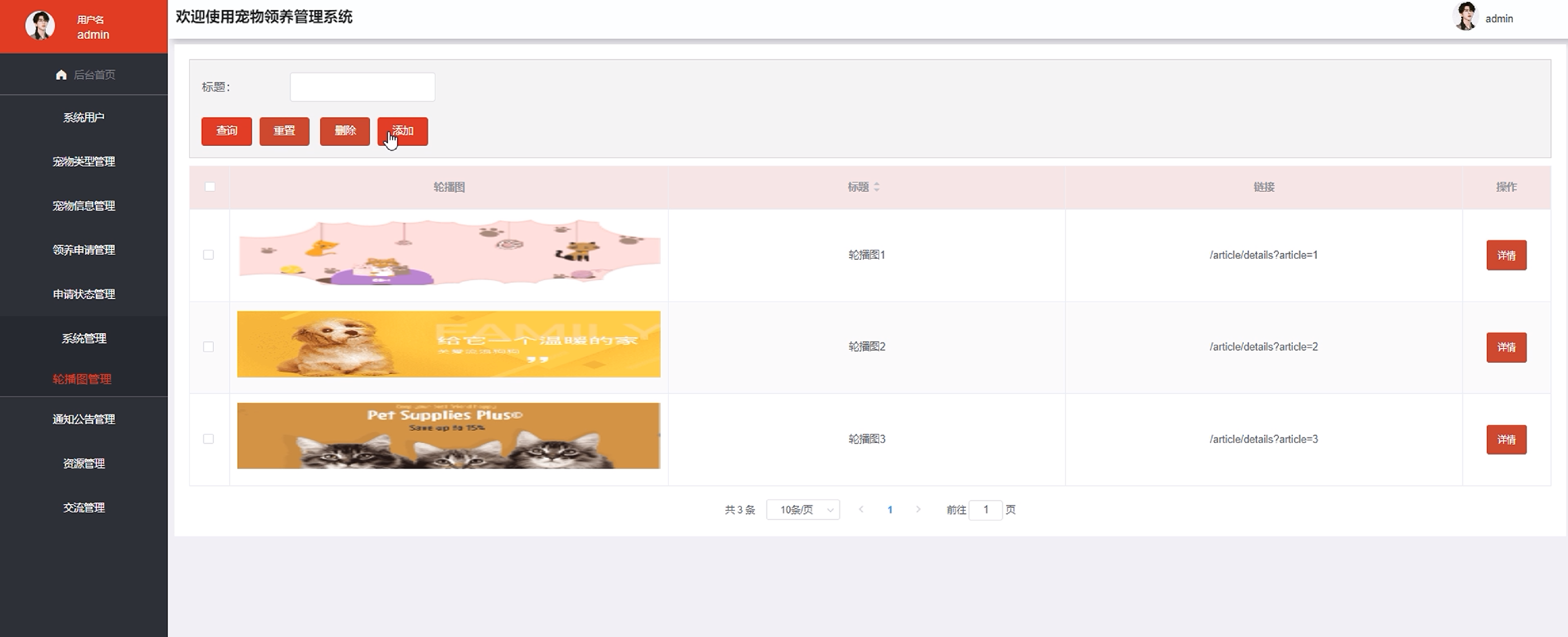 系统管理:管理员点击可查看轮播图管理;如需添加新的轮播图,点击右侧“添加”按钮,上传图片,输入标题和链接,点击“确认””按钮进行添加;同时可对轮播图进行增删改查。界面如图5-8所示。