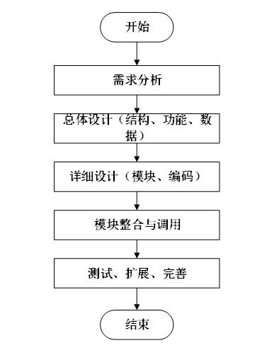 系统开发流程的主要步骤,从需求分析到系统完成的全过程。流程包括需求分析、总体设计(结构、功能、数据)、详细设计(模块、编码)、模块整合与调用,以及测试、扩展和完善,最终完成系统的开发。本系统的开发流程如图3-3所示