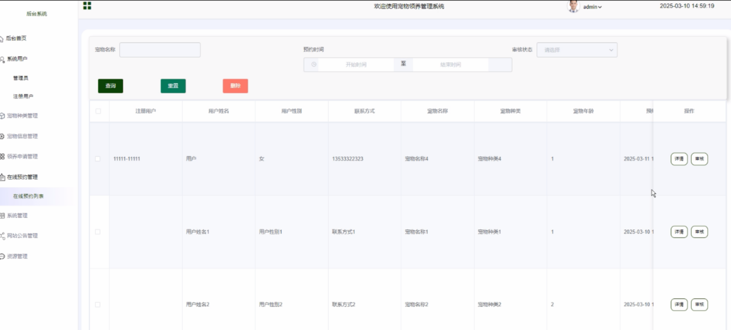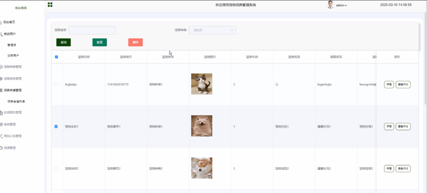 领养申请列表:查看所有用户的领养申请,支持审核操作(批准或拒绝)。