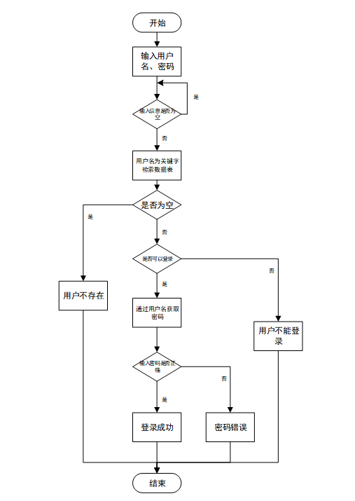 用户输入用户名和密码后,系统先检查输入是否为空,再验证用户名是否存在,若存在则通过用户名获取密码并校验。若密码正确则登录成功,否则提示密码错误。若用户名不存在或无法登录,提示用户操作无效。如下图所示。
