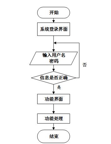 用户首先进入系统登录界面,输入用户名和密码后,系统验证信息是否正确。若验证失败,返回登录界面重新输入,若验证成功,则进入功能界面,执行相应功能处理后结束操作流程。操作流程如下图所示。