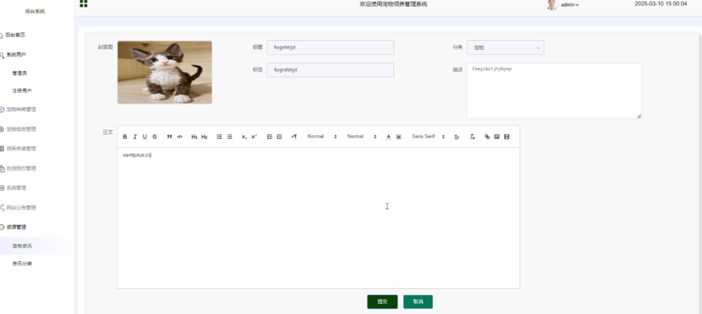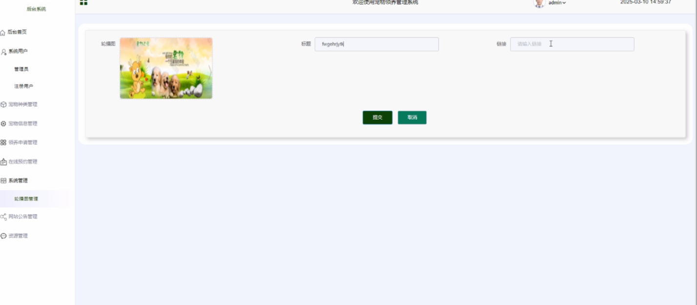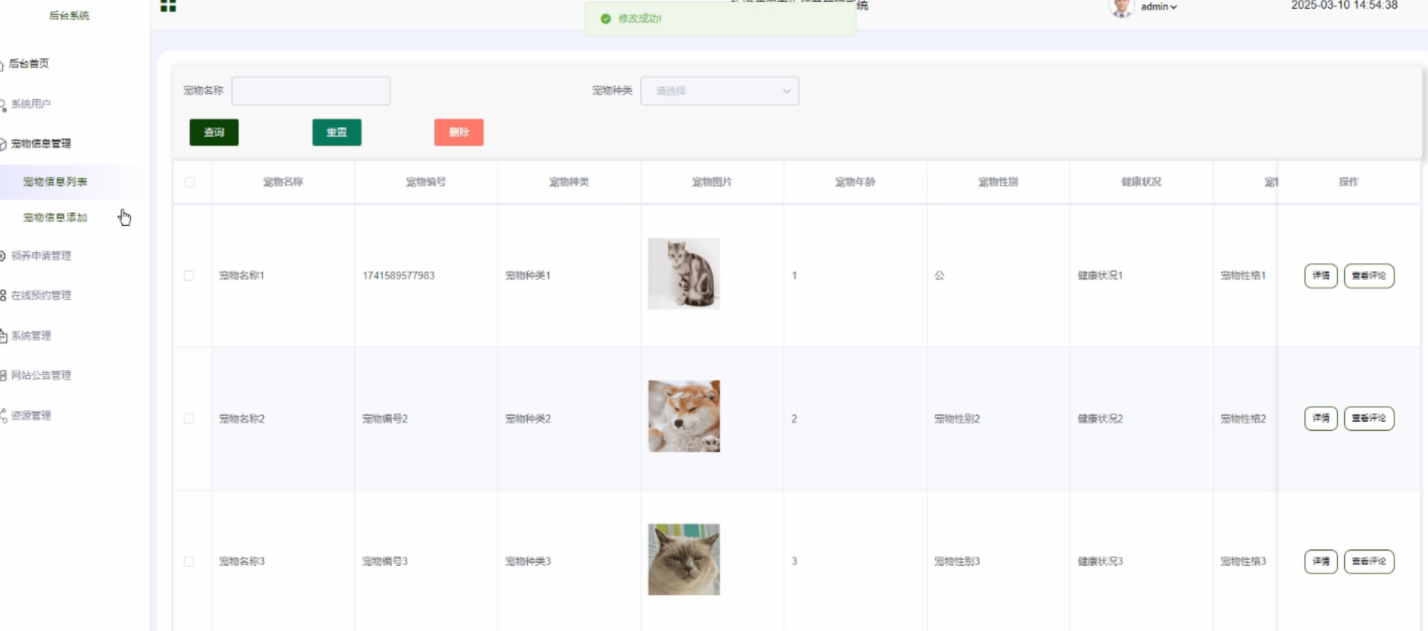 宠物信息添加:录入新的宠物信息,包括图片、简介、健康状况等。