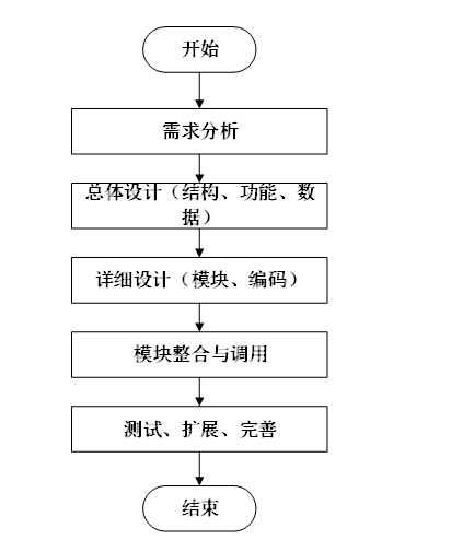 系统开发流程的主要步骤,从需求分析到系统完成的全过程。流程包括需求分析、总体设计(结构、功能、数据)、详细设计(模块、编码)、模块整合与调用,以及测试、扩展和完善,最终完成系统的开发。本系统的开发流程如下图所示