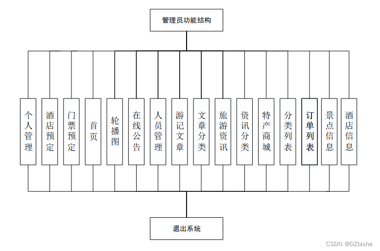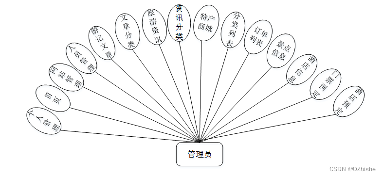 管理员功能模块包括:首页、网站管理(轮播图、在线公告)、人员管理(管理员、普通用户)、内容管理(游记文章、文章分类、旅游资讯、资讯分类)、购物管理(特产商城、分类列表、订单列表)、模块管理(景点信息、酒店信息、门票预定、酒店预定)、个人管理(个人信息、修改密码)模块。