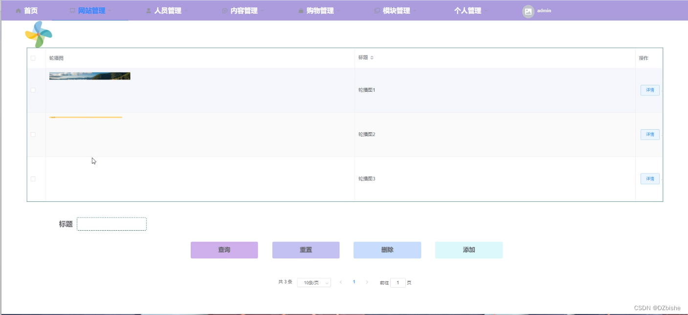 轮播图管理,在轮播图管理页面可以查看轮播图、标题等内容,并可根据需要进行修改或删除等操作,如图5-9所示。