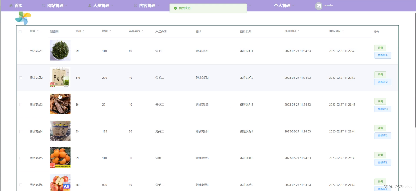 特产商城管理,在特产商城管理页面可以查看标题、封面图、卖价、原价、商品库存、产品分类、描述、备注说明等信息,并可根据需要进行查看评论、修改或删除等操作,如图5-11所示。