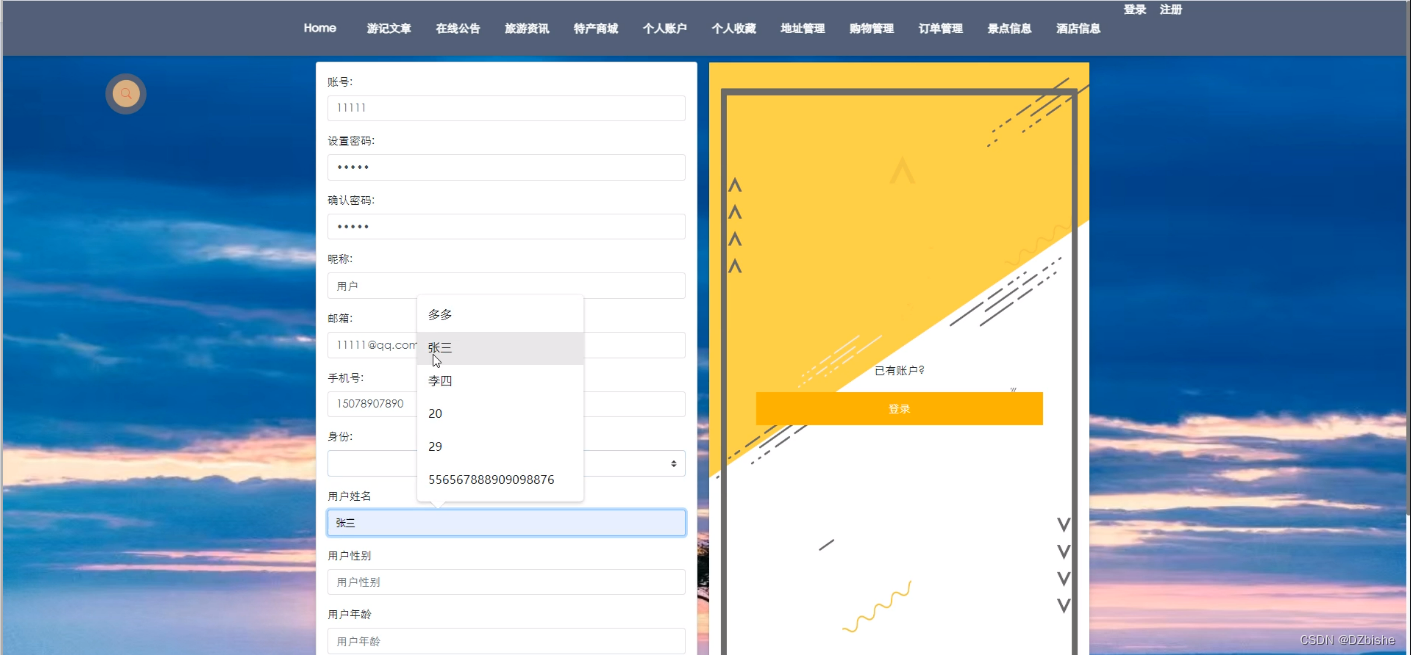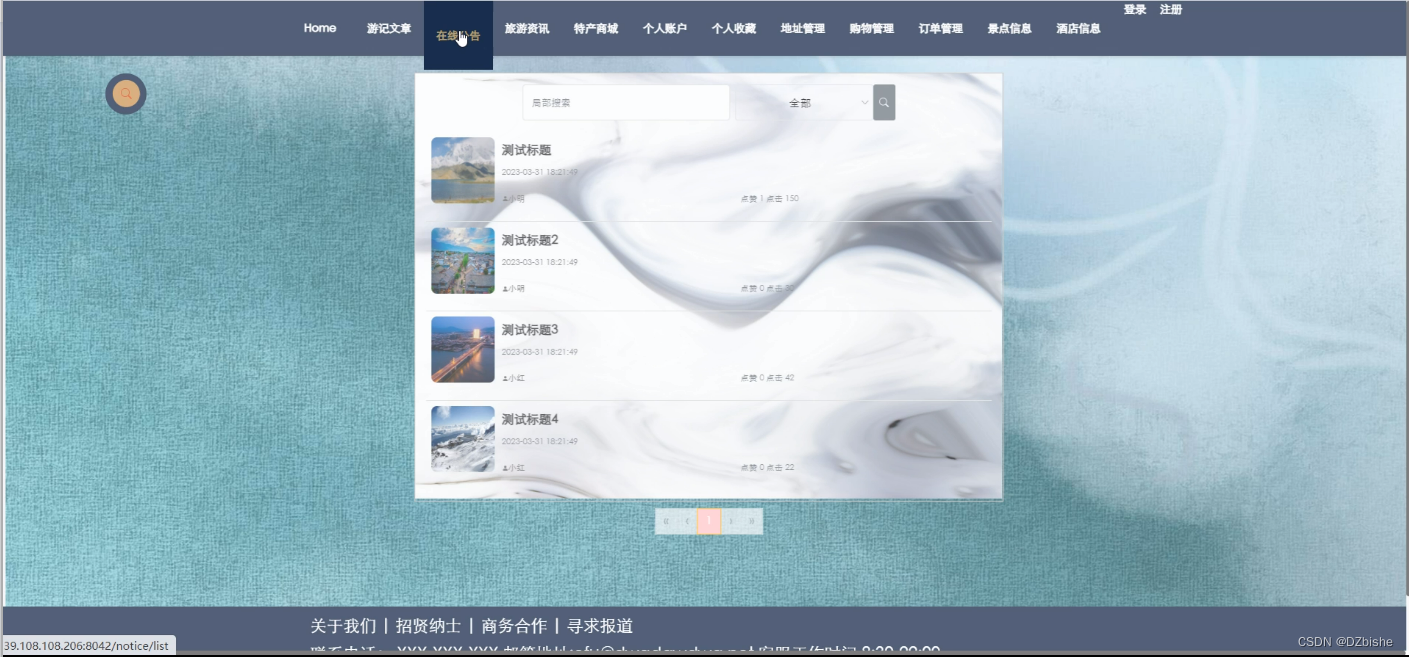 旅游景点推荐系统设计,在旅游景点推荐系统首页可以查看首页、游记文章、在线公告、旅游资讯、特产商城、个人账户、个人收藏、地址管理、购物管理、订单管理、景点信息、酒店信息、个人中心等内容,如图5-1所示。