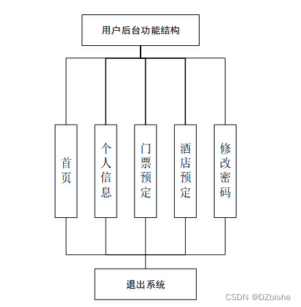 用户功能模块用户模块包括:首页、模块管理(门票预定、酒店预定)、个人管理(个人信息、修改密码)等模块。