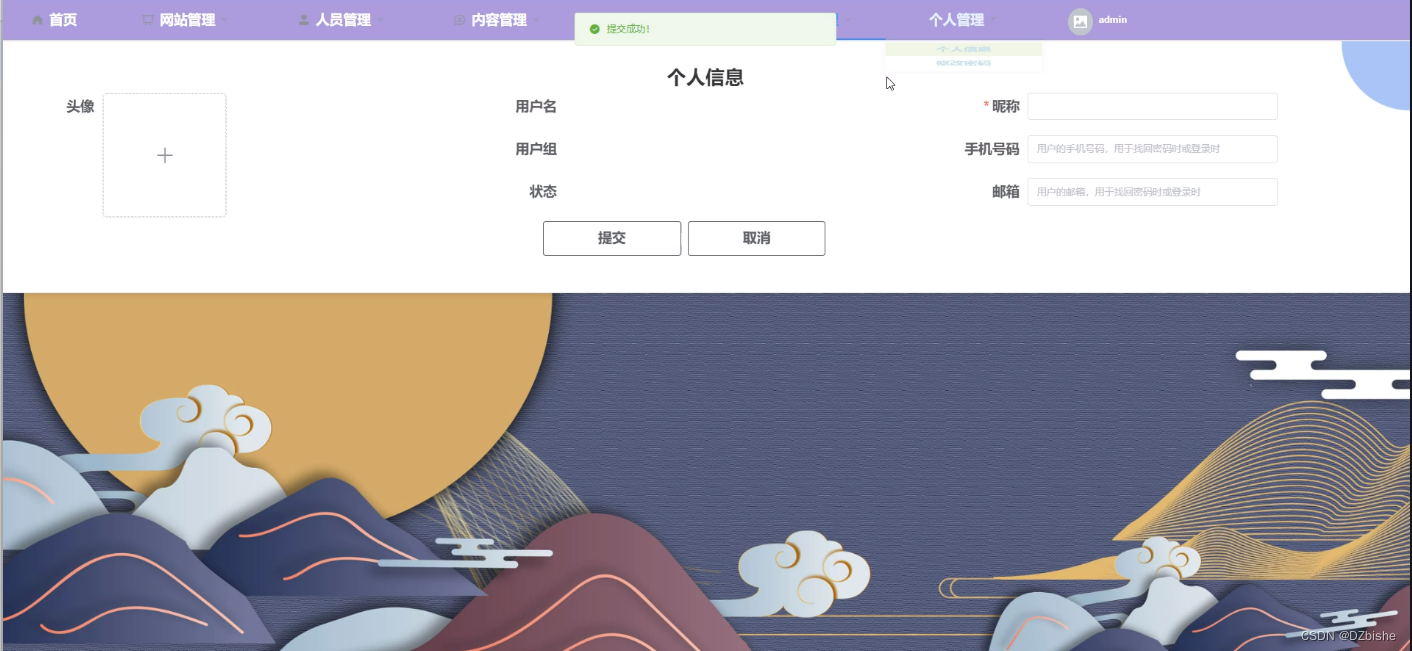 个人信息管理,在个人信息管理页面可以查看头像、用户名、用户组、状态、昵称、手机号码、邮箱等信息,如图5- 13所示。