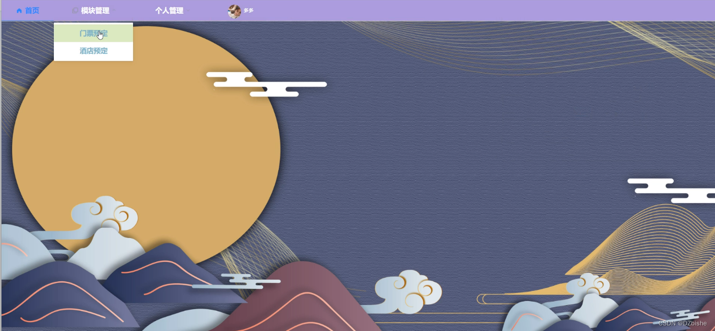 用户登录进入旅游景点推荐系统可以查看首页、模块管理(门票预定、酒店预定)、个人管理(个人信息、修改密码)管理等内容,如图5-14所示。