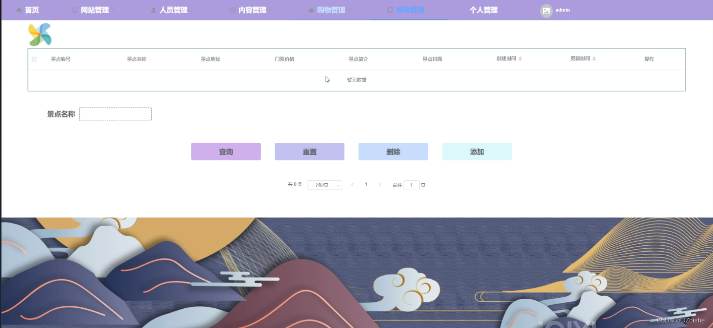 景点信息管理,在景点信息管理页面可以查看景点编号、门票价格、景点名称、景点简介、景点地址、景点封面等信息,并可根据需要进行修改或删除操作,如图5- 12所示。