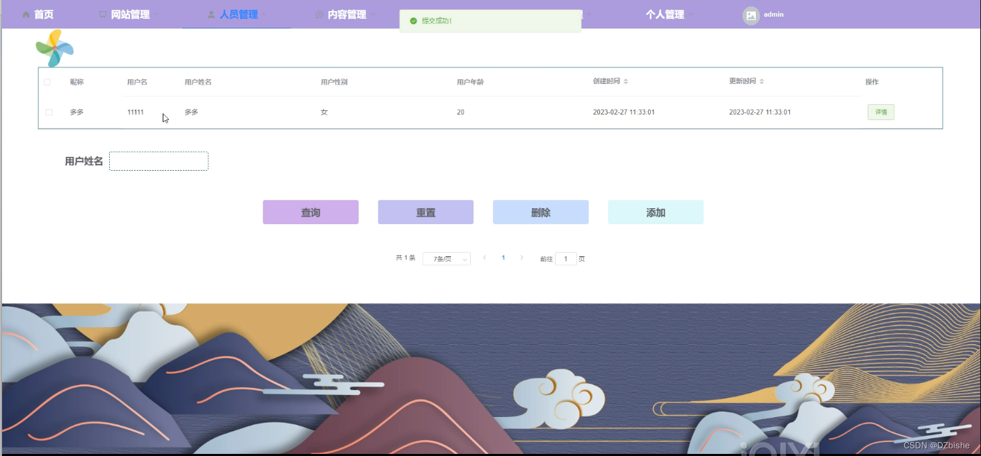 用户管理,在用户管理页面可以查看昵称、用户名、用户姓名、用户性别、用户年龄等信息,并可根据需要进行修改或删除等操作,如图5-8所示。