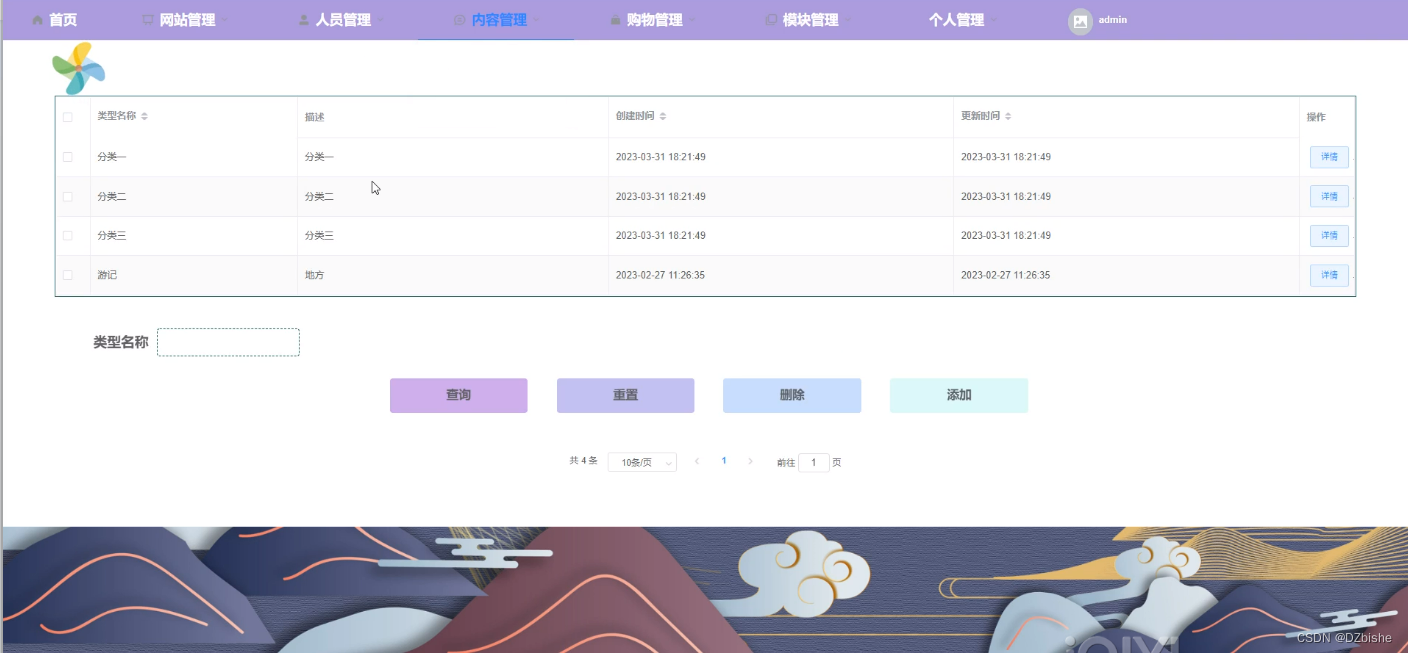 文章分类管理,在文章分类管理页面可以查看类型名称、描述等信息,并可根据需要进行修改或删除等操作,如图5-10所示。