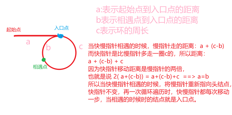 ,然后快慢指针同步移动,再次相遇的点即为入口。 -