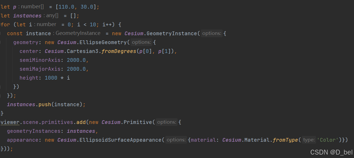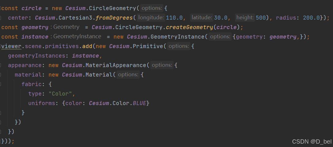 每个Geometry是通过GeometryInstance来进行实例化的,通过GeometryInstance对Geometry进行实例化,同一个Geometry可以被实例化多次。这对于展示大量数据时很有用,比如有10万个BoxGeometry需要被显示,只需要创建一个BoxGeometry,然后通过GeometryInstance来设置每一个的大小、位置、颜色等