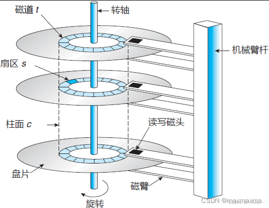 柱面:所有盘片上相同半径位置的磁道组成一个柱面。想象一下,多个盘片的同一个磁道上下对齐,形成一个圆柱面。磁头臂移动时,所有磁头是一起移动的。因此,访问同一柱面上的不同磁道(即不同盘片)不需要移动磁头臂,速度最快。