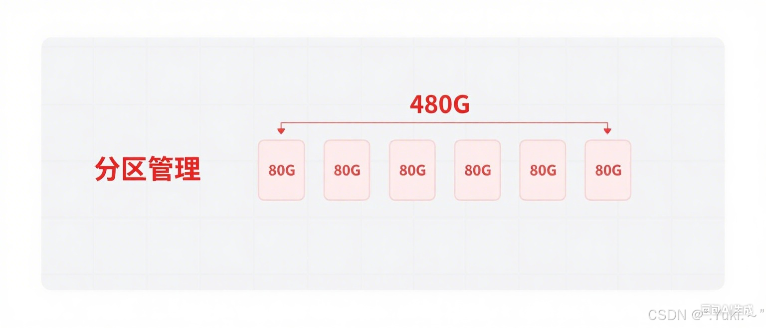 500G 和 100G 的管理方法一样,将 500G 分成 5 个 100G 管理就会轻松很多。如:将一块磁盘分成 C D E F … 盘,管理起来明显会变轻松。