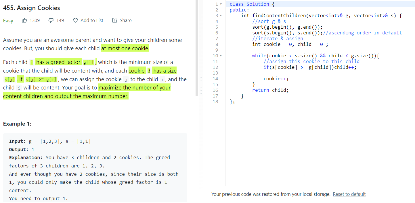【LeetCode刷题】Greedy贪心算法笔记 题目特点?-怎么判断一道题适合使用greedy?“最”–付出最少,得到最多->贪心是目的:想用最少的投入获得最大回报“给后面的选择留下最大余地,能确保全局最优”解题思路?流程:局部最优 => 前面的选择给后面的选择留下最大余地(比如:留下尽可能多的饼干||留下尽可能大的区间||需求最小的得到的最少)↓能确保全局最优(也就是结果正确)(逻辑自洽:如果我不留下尽可能多的饼干->也就是说新方案饼干减少,其他不变,那么能吃饱的人肯定会不变或减少->非最优方案;如果不留下尽