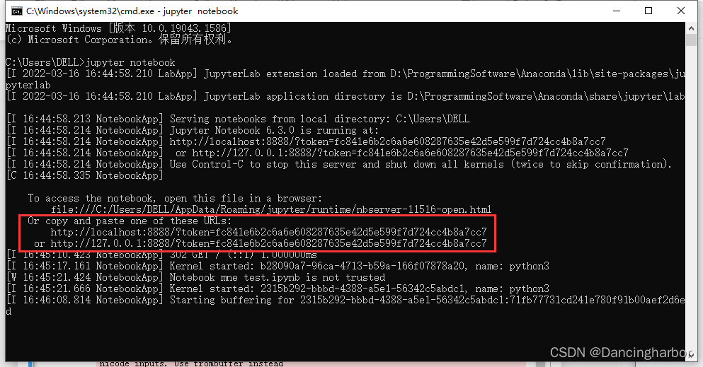 win+r,cmd,回车,打开命令行行云流水,输入jupyter notebook,然后在浏览器中输入红框中的地址即可进入jupyter notebook