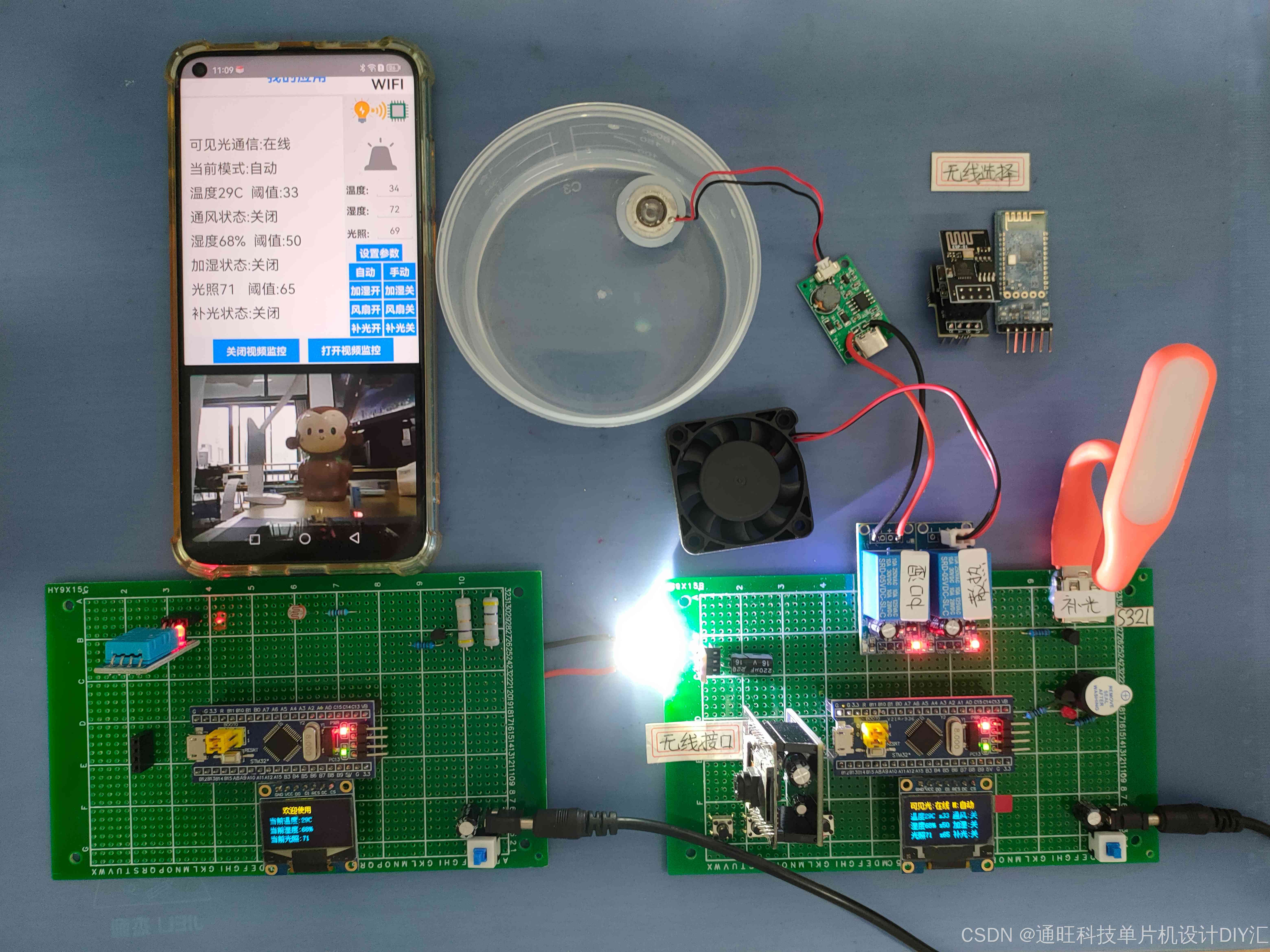 STM32-S321-可见光编码发射板+可见光接收解码板+光照+温湿度采集+风扇+加湿器+补光+OLED屏+声光提醒+按键+(无线方式选择)