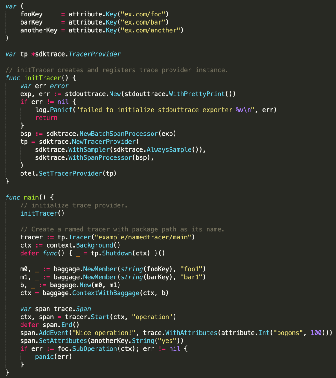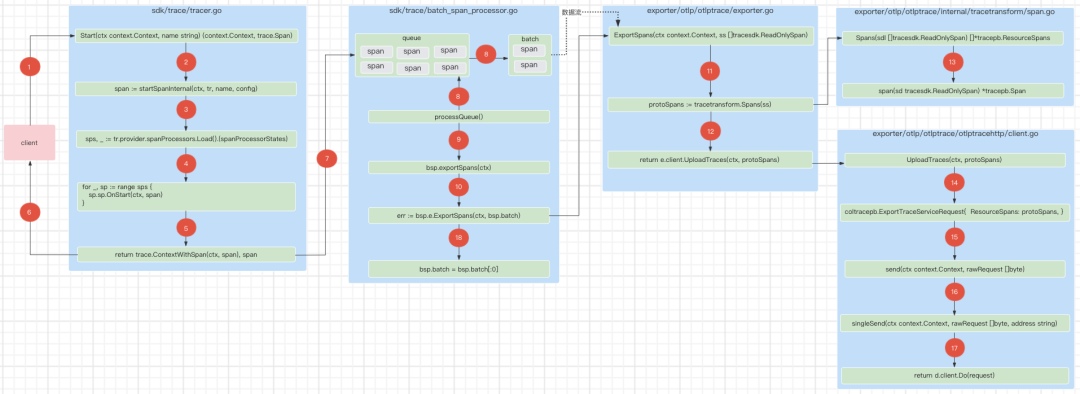 由于 Trace 是 OpenTelemetry 中,比较成熟的部分,下面以 opentelemetry-go 这个 SDK,来分析一下 Trace 部分的基本工作原理。对 Trace 本身的数据结构和知识点不在本篇文章中详解。