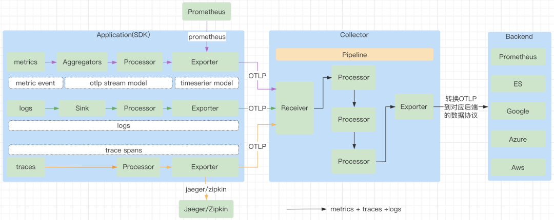 Backend: 负责持久化观测数据,Collector 本身不会去负责持久化观测数据,需要外部系统提供,在 Collector 的 exporter 部分,需要将 OTLP 的数据格式转换成 Backend 能识别的数据格式。目前社区的已经集成的厂商非常多,除了上述的开源的,常见的厂商包括 AWS,阿里,Azure,Datadog,Dynatrace,Google,Splunk,VMWare 等都实现了 Collector 的 exporter 能力。