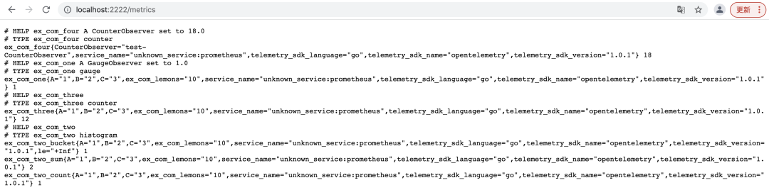 异步:类型匹配到 CounterObserver,UpDownCounterObserver,GaugeObserver。由 SDK 每次的收集周期执行一次异步类型 Instrument 设置的回掉函数,在回掉函数中设置监控数据。如每次收集间隔是,统计一下程序的运行时间。