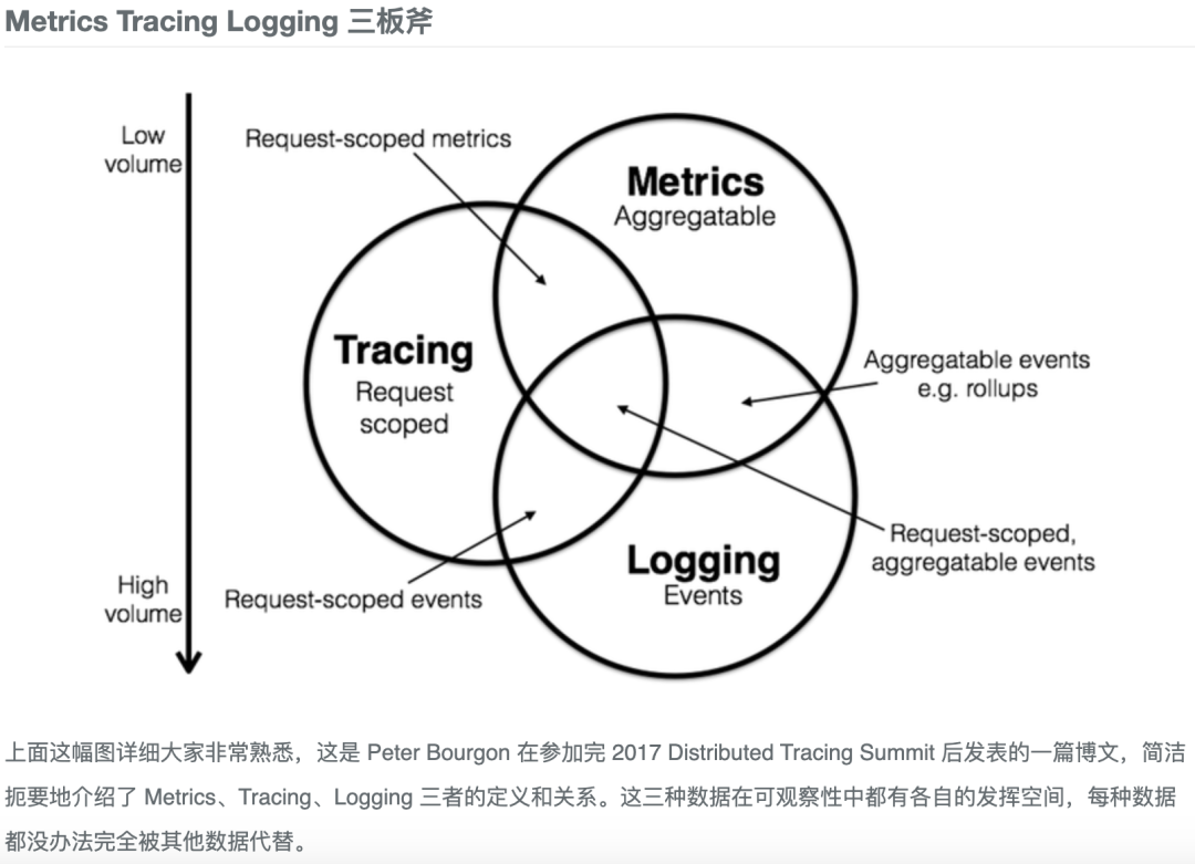在同一时刻通过 trace id 和 span id 将三大能力串起来。每一个部分都需要有时间,如监控是时序数据库,模式就带时间字段;如日志,日志框架都有时间这个字段;如链路,链路也都是有时间字段的。因为三者在采集的时候,每个模块的执行时机有先后顺序,但是可以保证的是这个时间范围肯定是在这次请求过程中,这样就可以将时间范围缩短到一个很短的时间范围内,来达到精确的定位问题。