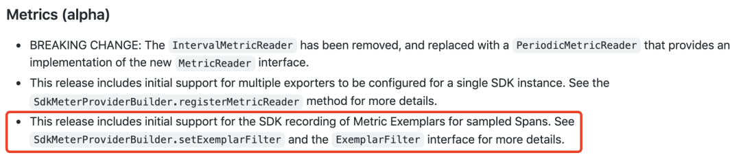 opentelemetry-java 最新版本是 1.7.0,已经支持了默认支持了 Exemplars,但还是 alpha 版本。OTEL_METRICS_EXEMPLAR_FILTER 这个环境变量默认值是 WITH_SAMPLED_TRACE 作,会自动将需要 sampled (trace中需要被采样的span) 的 trace id 以及 span id 和 metrics 关联起来。