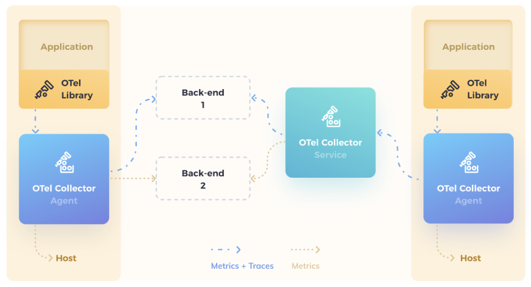 OTel Libraty:也称为 SDK,负责在客户端程序里采集观测数据,包括 metrics,traces,logs,对观测数据进行处理,之后观测数据按照 exporter 的不同方式,通过 OTLP 方式发送到 Collector 或者直接发送到 Backend 中。