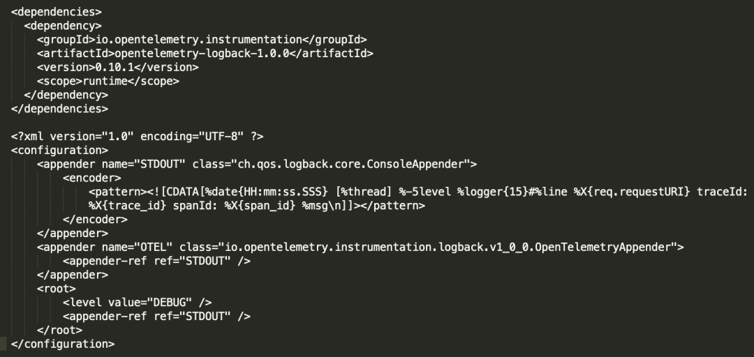 Logback 支持 Trace,引用 OpenTelemetry 提供的 jar 包,以及修改配置文件。
