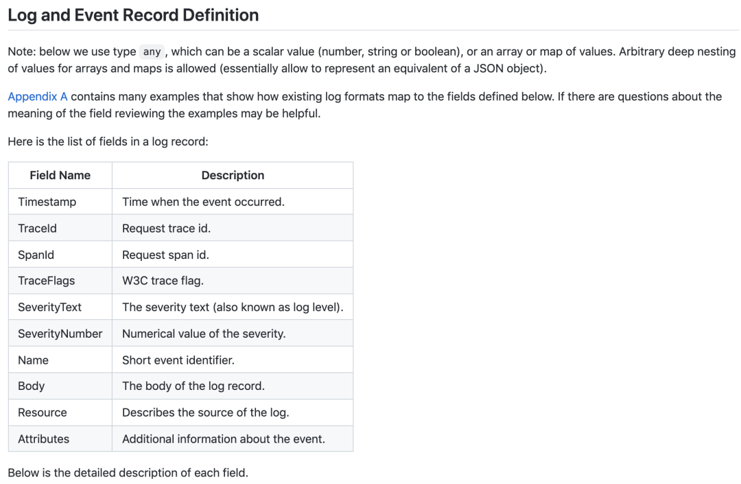以下介绍了 OpenTelemetry 中,Log 的数据格式规范。