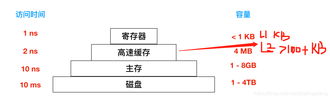 理想情况,内存比执行一条指令要快,从而不会拖慢CPU执行效率,足够大而且便宜。但实际情况是顶层的存储器速度最高,容量最小,但成本非常高,层级结构越向下,其访问效率越慢,容量越大,造价也越便宜