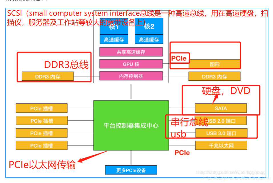 上图中的 x86 系统包含很多总线,高速缓存、内存、PCle、PCI、USB、SATA和 DMI,每条总线都有不同的传输速率和功能。操作系统必须了解所有的总线配置和管理。其中最主要的总线是PCIe(Peripheral Component Interconnect Express)总线。